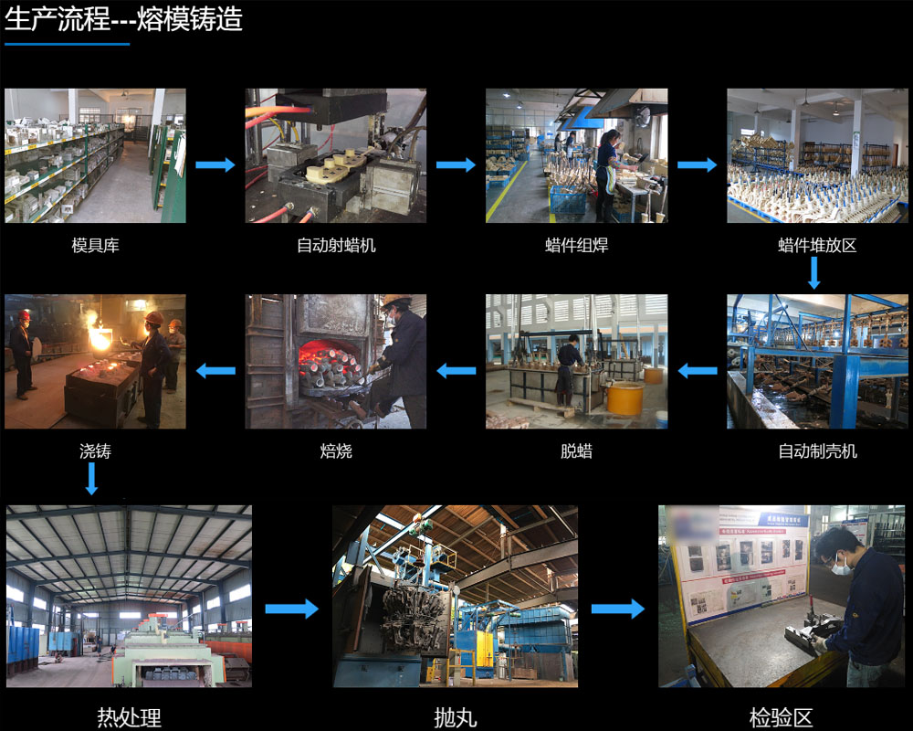 熔模鑄造工藝包括幾個(gè)步驟:金屬模具制造,蠟?zāi)Ia(chǎn),模殼制造,澆鑄,清砂切割, 打磨精整。